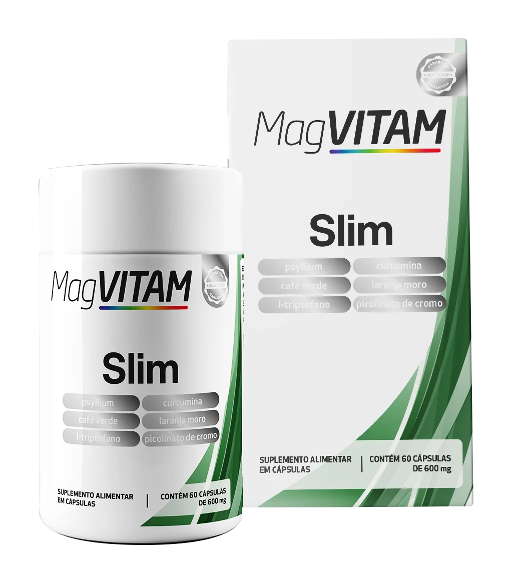 O MagVITAM Slim combina Psyllium, Cúrcuma, Guaraná, Café Verde, L-triptofano, Laranja Moro e Picolinato de Cromo para auxiliar no controle de peso. Ele promove saciedade, acelera o metabolismo e ajuda a reduzir a vontade de comer doces. Ideal para quem busca emagrecer de forma saudável, também contribui para a queima de gordura e melhora do bem-estar geral.