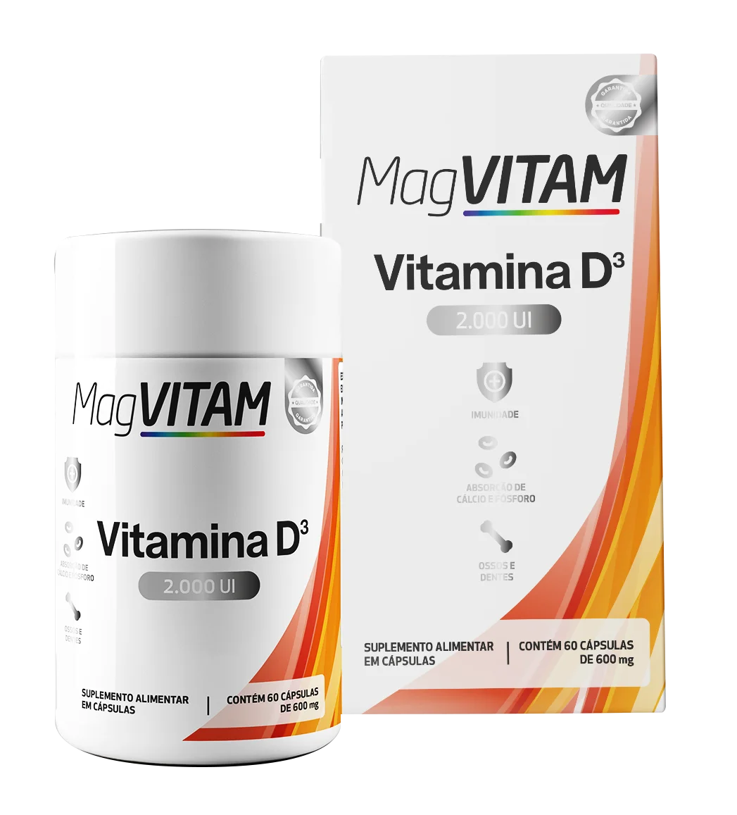 A Vitamina D da MagVITAM, conhecida como a “vitamina do sol”, é essencial para a saúde dos ossos, dentes e músculos. Com 2.000UI, ela auxilia na absorção de cálcio e fósforo, prevenindo doenças como raquitismo e desmineralização óssea. Além disso, fortalece o sistema imunológico, ajudando o corpo a responder de forma adequada a diversas deficiências e condições.
